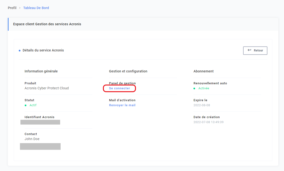 Après l’ouverture de la fenêtre correspondante, cliquez sur le lien Se connecter afin d’ouvrir votre panel de gestion Acronis.