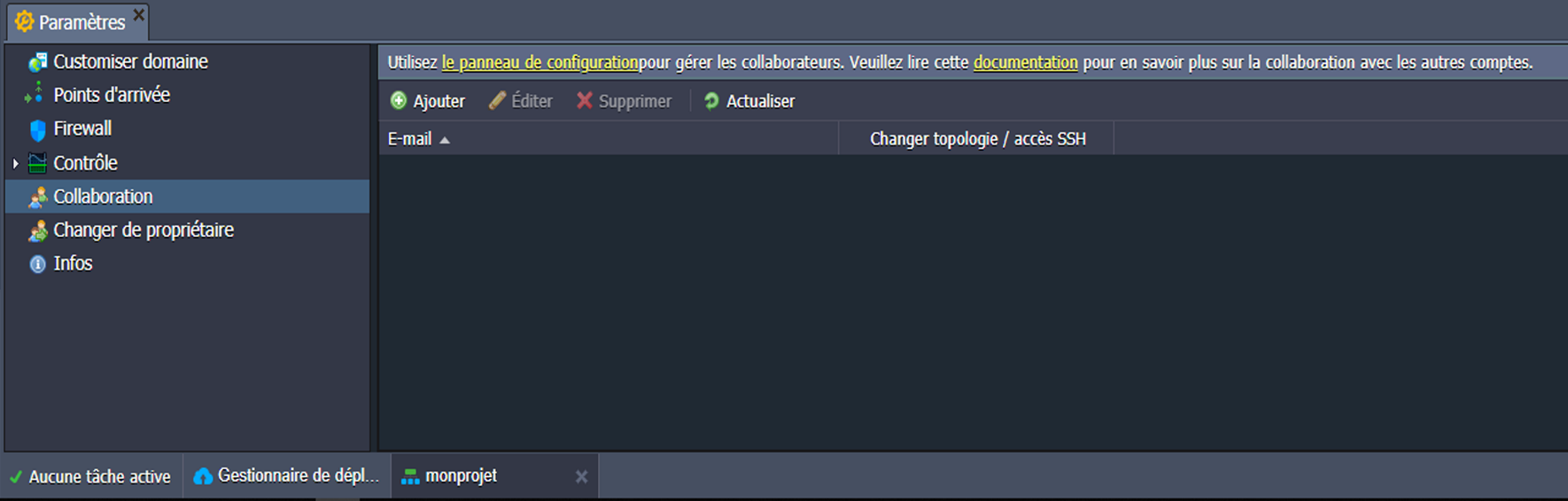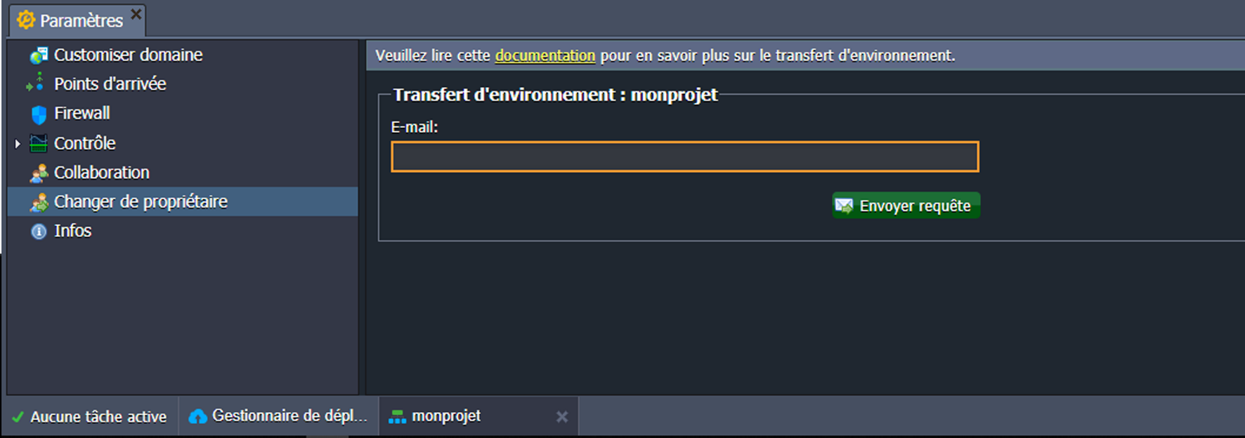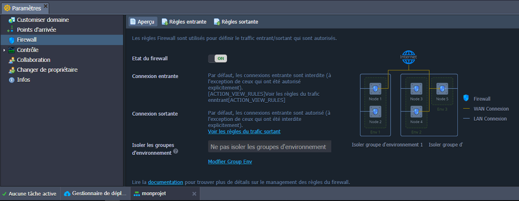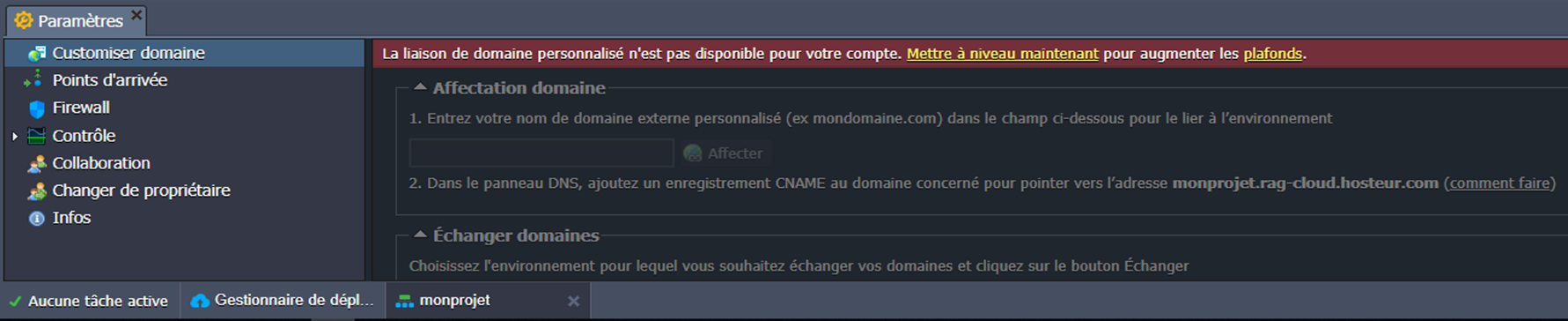 Il y a sept (07) options dans l'onglet Paramètres d'environnement : Customiser domaine, Points d’arrivée, Firewall, Contrôle, Collaboration, Changer de propriétaire et Infos.