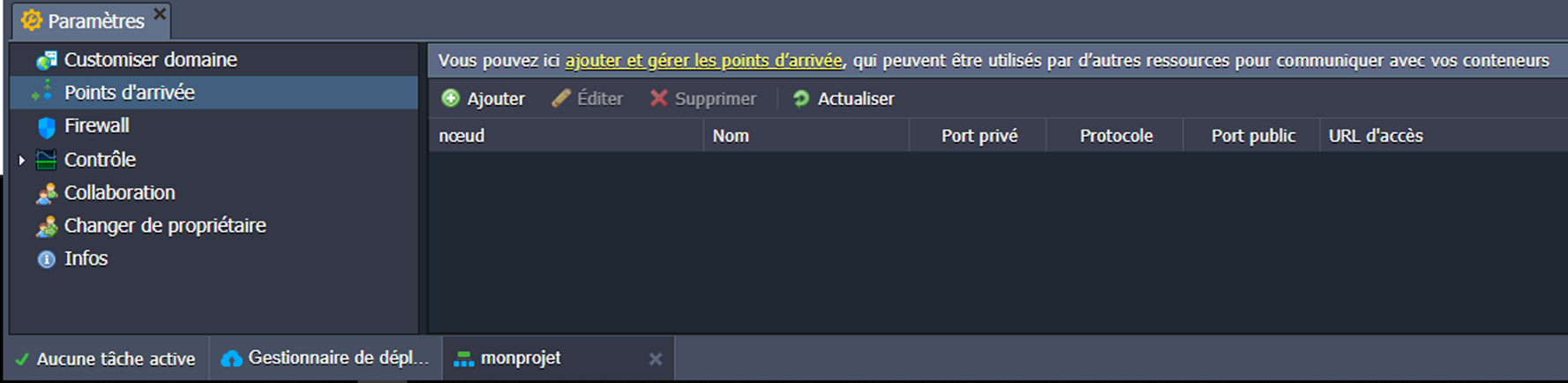2. Dans la section Points d’arrivée, vous pouvez gérer le mappage (configuration) des ports TCP/UDP de vos conteneurs pour assurer leur collaboration avec des ressources externes via une connexion directe.