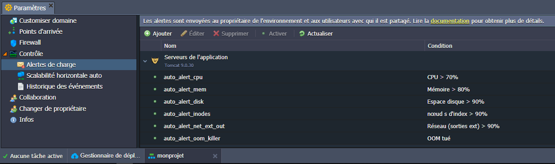 Utilisez les Alertes de charge pour définir de nouveaux déclencheurs (ou ajuster ceux par défaut) afin de recevoir les notifications par e-mail appropriées au cas où l'utilisation de la ressource spécifiée dépasse les limites indiquées.
