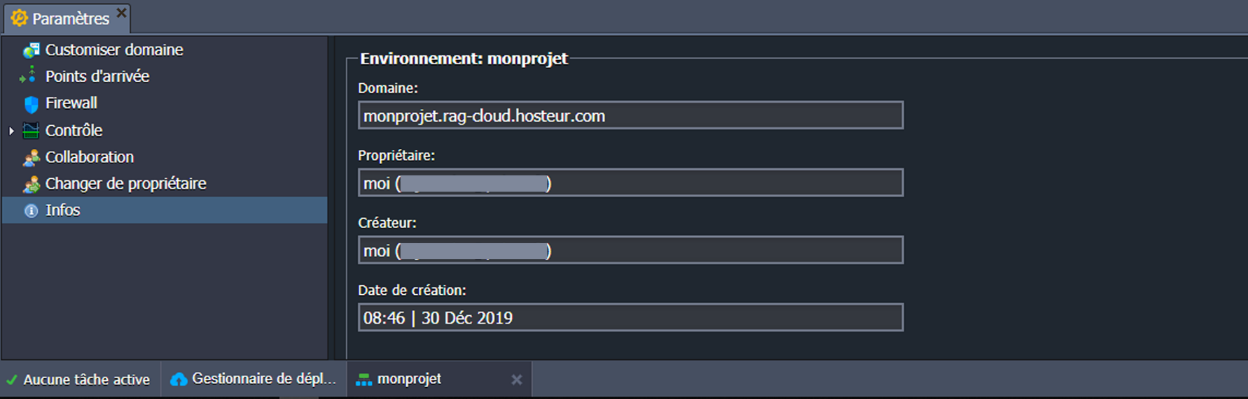 7. Passez à la section Infos pour voir des informations supplémentaires sur le domaine de l’environnement, son propriétaire et son créateur (qui peuvent être différents en raison de la fonction de collaboration du compte), la date de création.