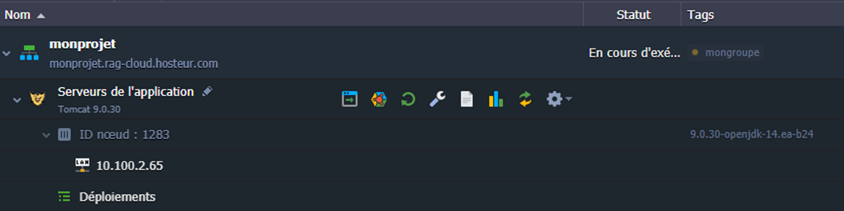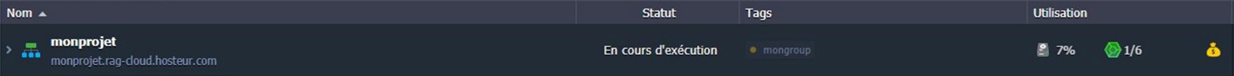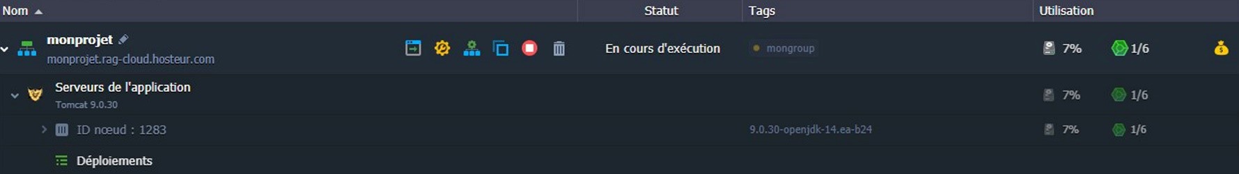 •    La colonne Statut indique l'état actuel de vos environnements (Exécution, Mise en veille, Arrêt, Création, Lancement, Clonage, Redéploiement, Exportation, Installation, Migration, Suppression).