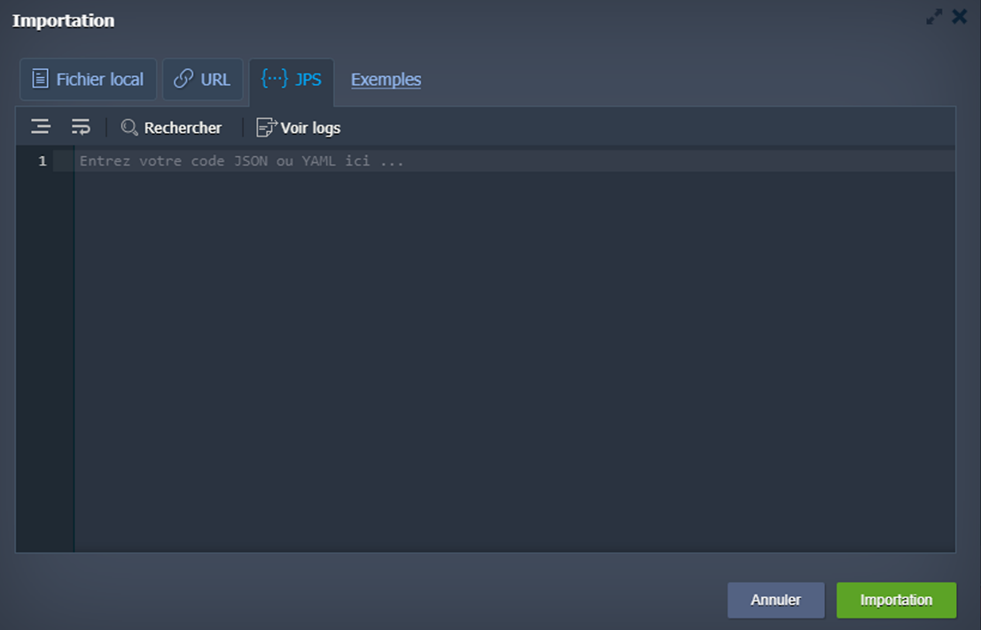 •    JPS - l'éditeur JSON/YAML intégré peut être utilisé pour insérer et éditer votre code avant le déploiement, ou même pour déclarer manuellement votre paquet à partir de zéro