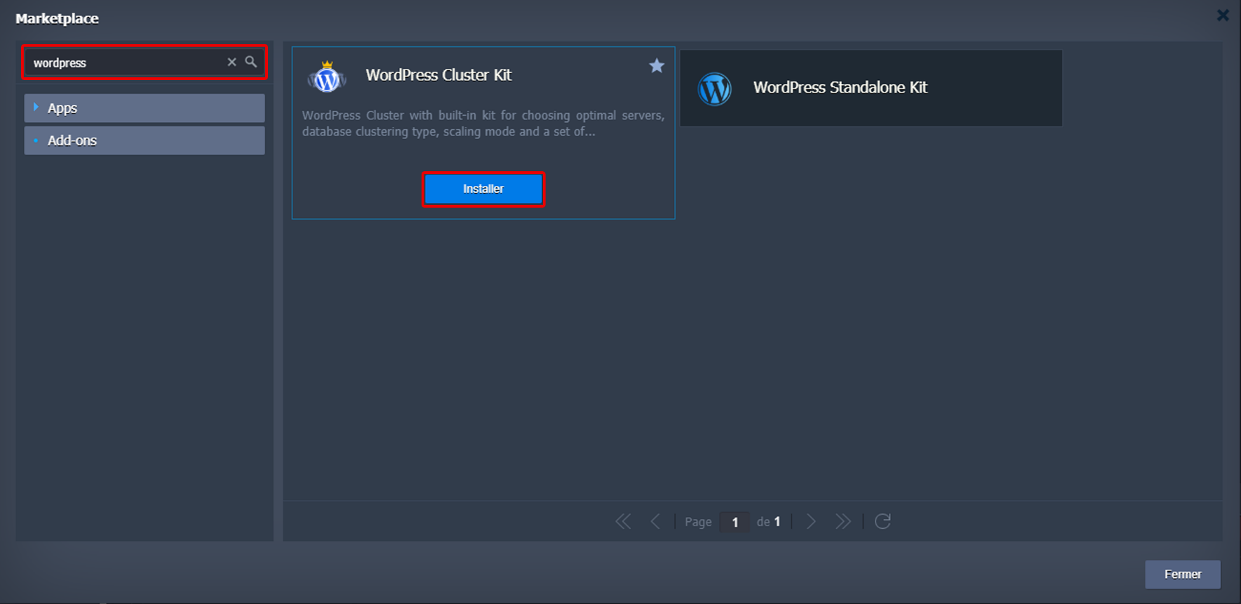 En cliquant sur la dernière option Marketplace dans le panneau supérieur du tableau de bord, vous accédez à une fenêtre avec une liste des solutions pré-packagées pour l'installation automatique.