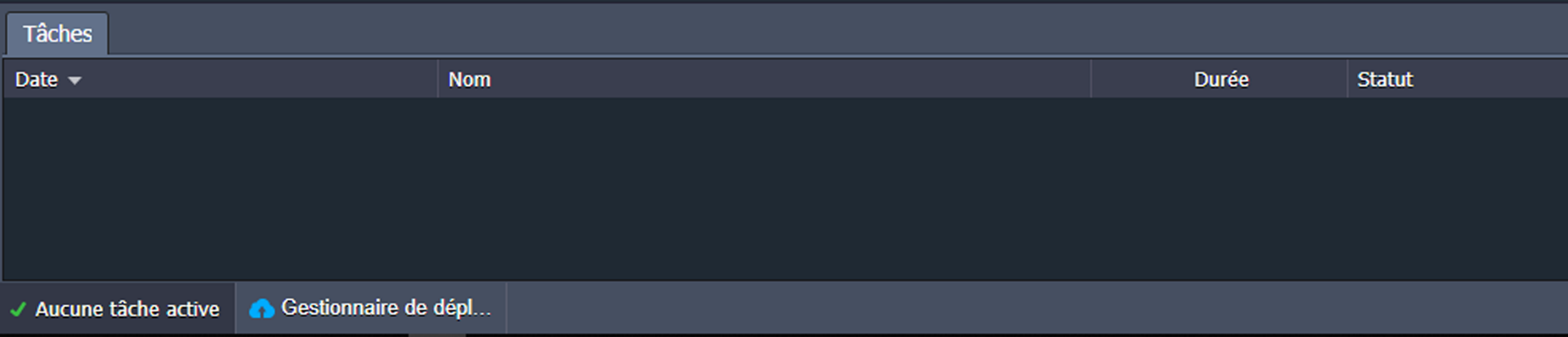 Ce panneau comprend les colonnes Date, Nom, Durée et Statut, fournissant des informations détaillées sur chaque tâche :
