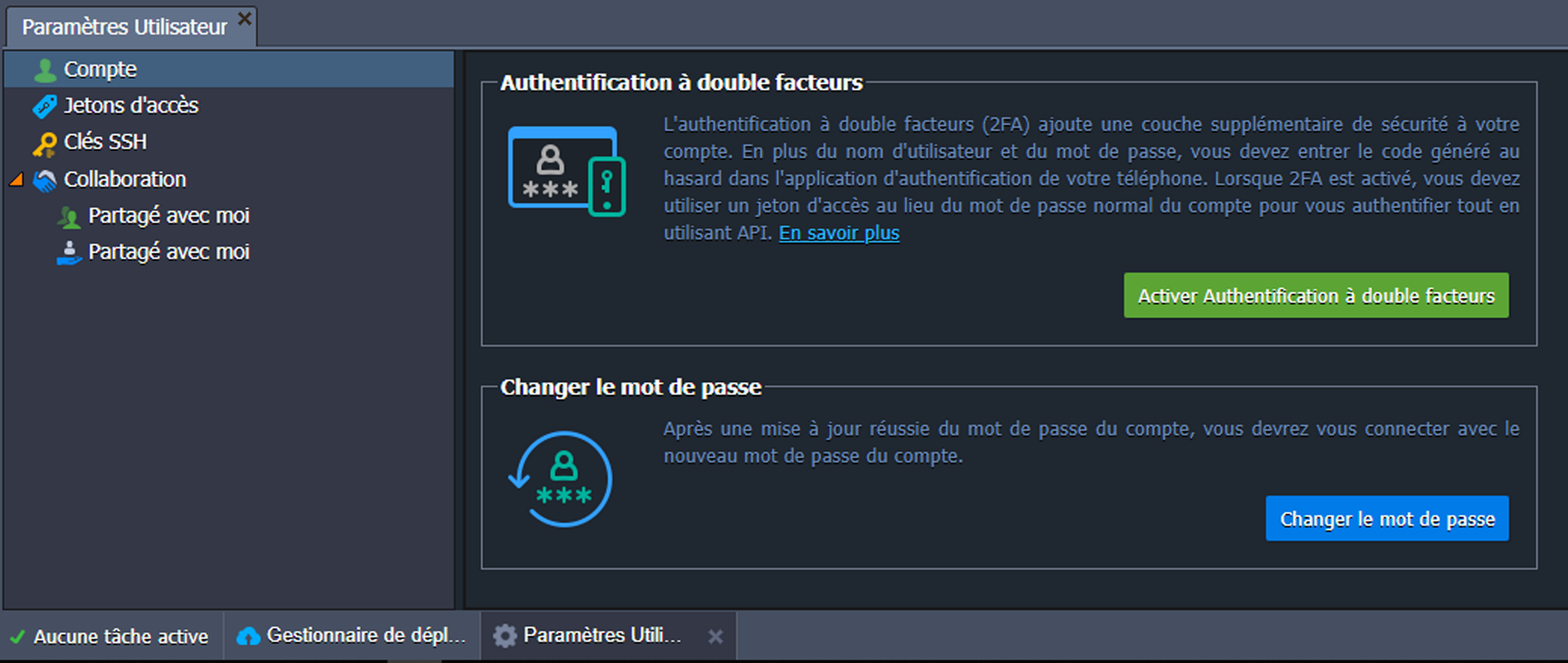 Ici, vous trouverez les sections suivantes : Compte, Jetons d'accès, Clés SSH et Collaboration.