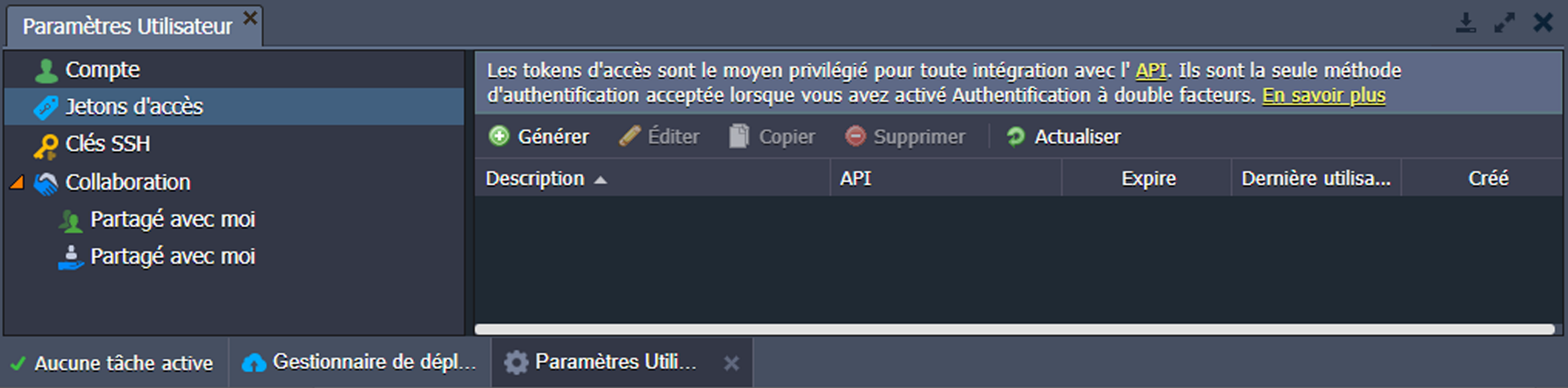 2. Dans l'onglet Jetons d’accès, vous pouvez configurer des jetons d'accès personnels pour votre compte.