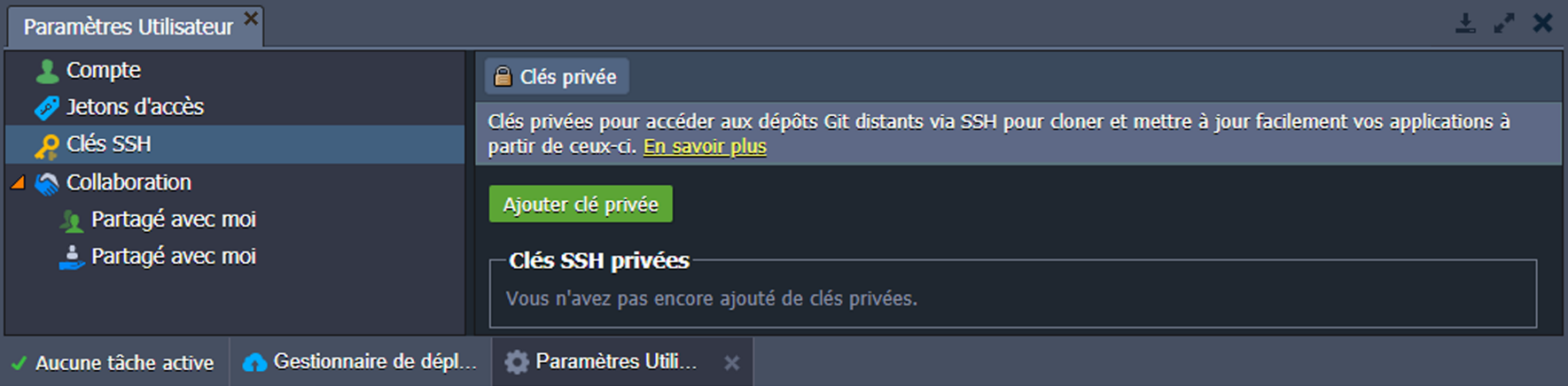 •    Clés privées : liste des clés privées ajoutées à la plateforme (requises pour l'accès à votre dépôt Git privé via SSH)