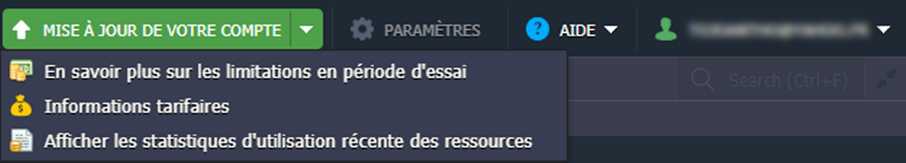 •    L'option En savoir plus sur les limitations en période d'essai ouvre l'onglet Limites de compte dans la fenêtre Quotas et Tarifs.