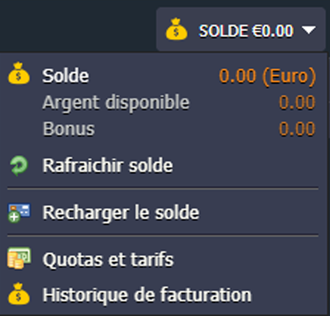 •    Solde indique le solde actuel du compte (à la fois Argent disponible et Bonus). En cliquant sur la section, vous pouvez ouvrir l'onglet Recharger le solde.