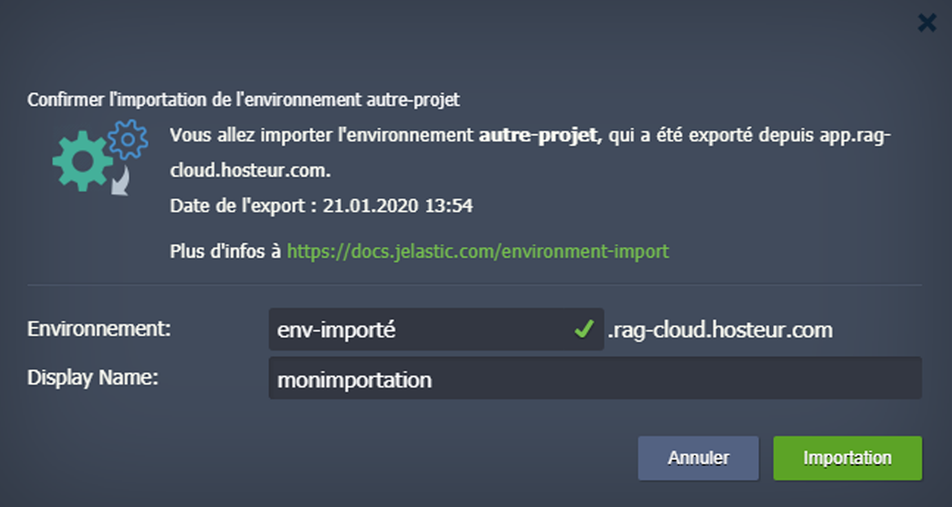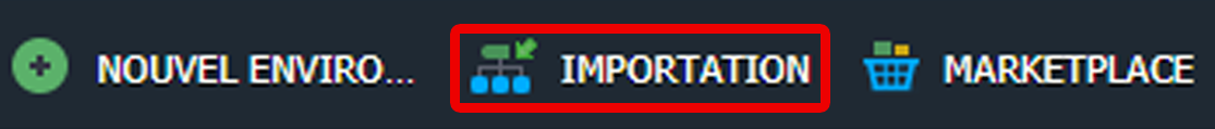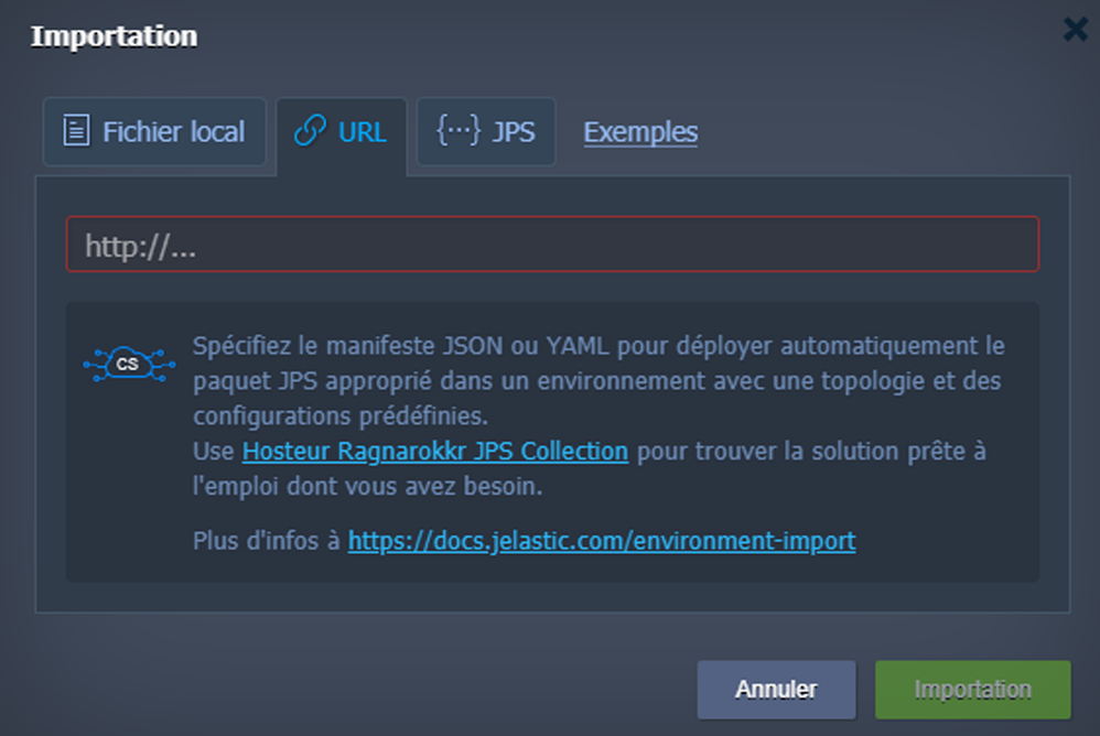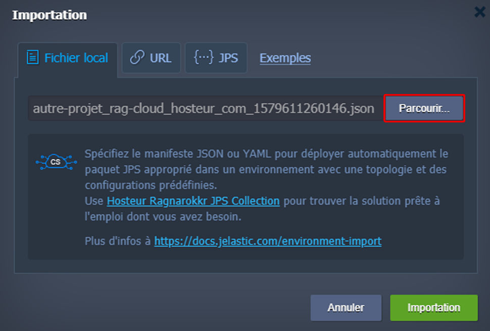 La fonction d'importation de l'environnement RAGNARØKKR permet de télécharger un fichier .json, .jps, .cs, .yml ou .yaml et de l'exécuter sur une plateforme afin d'installer et de configurer un projet en fonction des paramètres qui y sont déclarés. Étant initialement conçu pour déployer les copies d'environnement précédemment exportées (par exemple pour transférer une application d'une autre installation RAGNARØKKR), il peut également être utilisé pour installer vos propres solutions, déclarées via JSON, ou intégrer tout paquet prêt à l'emploi de la collection RAGNARØKKR JPS.
