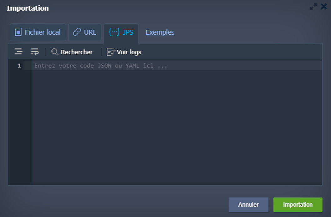 • JSON : l'éditeur intégré permettant soit d'insérer et de modifier votre code à la volée avant le téléchargement, soit de composer manuellement votre propre solution à partir de zéro