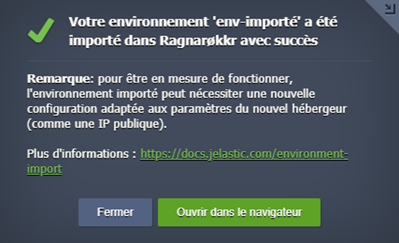 Ici, vous pouvez ouvrir votre nouvel environnement dans le navigateur pour vérifier le résultat, ou fermer cette fenêtre pour reconfigurer d'abord votre environnement et votre application en fonction des paramètres de la nouvelle plateforme (par exemple, en raison de changements de noms d'hôtes, d'adresses IP, etc.).