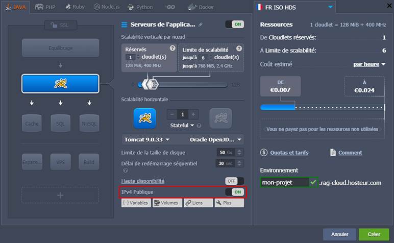 - L'IP publique est une option payante, qui est facturée pour chaque heure d'utilisation. Le prix exact peut être consulté dans la fenêtre Quotas et tarifs > Prix > Options du tableau de bord.