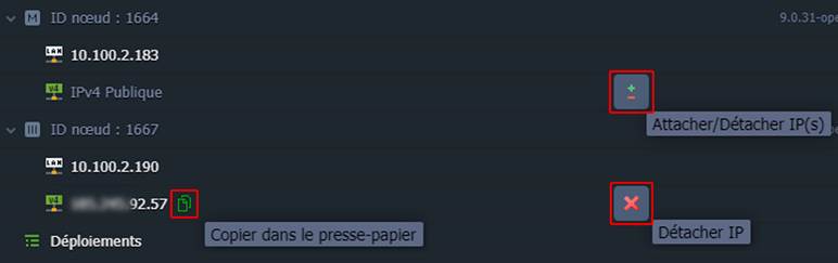 - Attacher/Détacher IP(s) : permet d’attacher une IP publique au nœud