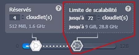La limite de scalabilité fixe un nombre maximum de cloudlets pouvant être alloués à chaque serveur. Vous pouvez donc l'utiliser pour définir un budget maximum possible pour votre projet. Par la suite, les cloudlets seront automatiquement ajoutés à vos serveurs en fonction de la consommation des ressources de l'application. Ils sont appelés « Cloudlets dynamiques » car ils sont ajoutés (à mesure que votre consommation de ressources augmente) et retirés (à mesure que votre consommation de ressources diminue) de manière dynamique. Vous payez donc sur la base de l'utilisation horaire réelle.