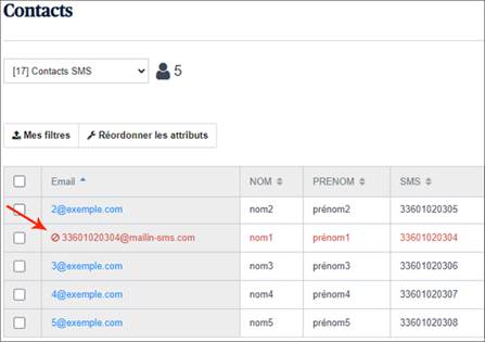 · Si, lors de l’importation de vos contacts SMS, vous n’avez pas renseigné l’adresse email d’un contact, une adresse email fictive du type numérodetélé[email protected] lui sera automatiquement donnée, et le contact s’affichera en rouge.