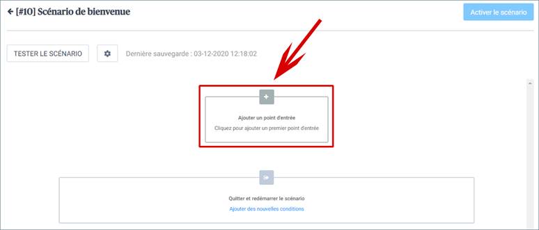 • Un point d’entrée qui est la première condition, permettant de filtrer les contacts entrant dans le scénario. Il est possible d’ajouter plusieurs points d’entrée ;
